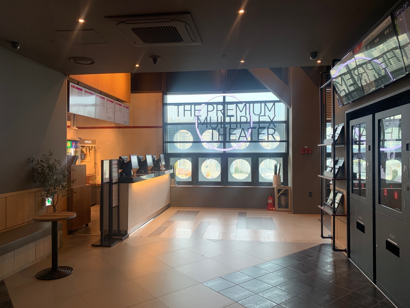 에스컬레이터에서 내리시면 팝콘 파는 곳(?)이 보입니다! 왼쪽으로 꺽으면 아래 사진과 같이 상영관 두 곳이 나옵니다. 영화관이 작아서 그런지 여기는 따로 티켓부스가 없고 위에 사진 오른쪽에서 볼 수 있듯이 티켓기계(?)로 티켓을 구매하시면 됩니다!(예매 티켓도 기계에서 뽑으면 됩니다!)
